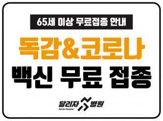 달리자병원 어르신 독감&코로나 무료접종 안내만 65세 이상 어르신들의 건강을 지키기 위한 독감(인플루엔자) 및 코로나19 예방접종이 아래와 같이 무료로 시행됩니다.접종 기간2025.10.22~2026.04.31접종 대상만 65세 이상 어르신 (1960.12.31 이전 출생자)접종 장소달리자병원또는 위탁의료기관 및 보건소유의사항* 접종 당일 신분증을 반드시 지참해주세요.* 접종 후 15~30분간 이상반응 관찰이 필요합니다.* 컨디션이 좋지 않거나 발열이 있는 경우, 접종을 미루시는 것을 권장합니다.문의1670-7515 네이버톡톡/카카오플친 @달리자병원다가오는 겨울, 어르신들의 건강한 겨울나기를 위해 예방접종을 꼭 하시길 바랍니다.감사합니다.