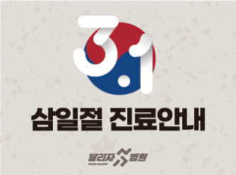 안녕하세요, 달리자병원입니다.대한민국의 독립을 위해 헌신하신 순국선열들의 숭고한 희생정신을 기립니다.달리자병원은 그 정신을 이어받아, 연휴 기간에도 지역 주민분들의 건강을 지키기 위해 쉼 없이 자리를 지키겠습니다.삼일절 당일(일)과 대체공휴일(월) 모두 정상진료를 시행하오니 내원에 참고하시기 바랍니다. 02.28(토) ▶ 정상진료03.01(일) ▶ 정상진료 (삼일절)03.02(월) ▶ 정상진료 (대체공휴일)진료시간 ▶ AM 9:00 - PM 2:00 (점심시간 없이 진료)평안하고 뜻깊은 삼일절 보내시길 바랍니다.감사합니다.