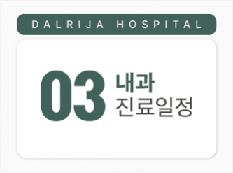 척추관절, 골절외상, 내과검진365일 함께 달리는 달리자병원입니다.달리자병원 내과 3월 진료 일정입니다. 3월1일(일), 3월2일(월) 휴진 (삼일절, 대체공휴일)3월7일, 3월21일 토요일 휴진일요일 휴진※ 매주 금요일 오후 휴진(오전9시 - 오후1시까지 진료)※ 일요일 및 공휴일 휴진※ 토요일 격주 휴진내원 및 예약 시 참고해주시기 바랍니다.--------------------------★--------------------------달리자병원 예약방법대표번호 1670-7515네이버톡톡 / 카카오플러스 @달리자병원