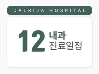 척추관절, 골절외상, 내과검진365일 함께 달리는 달리자병원입니다.달리자병원 내과 12월 휴진 안내입니다. 12월13일(토) 휴진12월25일(목) 휴진12월27일(토) 휴진일요일 휴진※ 매주 금요일 오후 휴진(오전9시 - 오후1시까지 진료)※ 일요일 및 공휴일 휴진※ 토요일 격주 휴진내원 및 예약 시 참고해주시기 바랍니다.--------------------------★--------------------------달리자병원 예약방법대표번호 1670-7515네이버톡톡 / 카카오플러스 @달리자병원