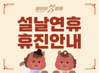 어느덧 새해가 시작되고,설날 연휴가 한 달 앞으로 다가왔습니다.연휴 기간 중 진료 일정에 대해미리 안내드리오니, 병원 방문 계획이 있으신 분들께서는아래 내용을 참고해 주시기 바랍니다. 2월 15일 일요일 ~ 18일 수요일 휴진다가오는 설날,가족과 함께 건강하고 따뜻한 시간 보내시길 바라며달리자병원은 새해에도 변함없이지역 주민 여러분의 건강을 함께하겠습니다.감사합니다.