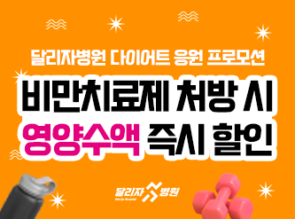 안녕하세요.당신과 함께 365일 달리는 달리자병원입니다.새해를 맞이해 다이어트 계획 세우신 분들 많을텐데요,건강하게 다이어트 성공하실 수 있게 달리자병원이 준비한 이벤트를 소개합니다."비만치료제 처방 시 영양수액 즉시 할인" 기간 : 별도의 기간 없이 상시로 진행됩니다. (미운영 시 게시글 삭제)대상 : 위고비, 마운자로를 처방받은 지 2개월 이내인 분혜택 : 활력수액, 봄날수액 中 택1하여 할인혜택 제공 ※주의사항1. 비만치료제는 전문의약품으로, 반드시 전문의와 진료 후 처방이 가능합니다.2. 해당 프로모션은 실손의료보험 청구용 의료진 발급 서류 발행이 불가합니다.3. 할인 혜택은 비만치료제 처방일 기준 2개월 이내입니다.4. 전문의의 진료 결과에 따라 처방이 제한될 수 있습니다.올해는 달리자병원과 함께 다이어트 성공하시길 바랍니다.전화문의 1670-7515채팅문의 네이버톡톡 or 카카오플친@달리자병원