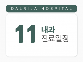 척추관절, 골절외상, 내과검진365일 함께 달리는 달리자병원입니다.달리자병원 내과 11월 휴진 안내입니다. 11월1일(토) 휴진11월15일(토) 휴진11월29일(토) 휴진일요일 휴진※ 매주 금요일 오후 휴진(오전9시 - 오후1시까지 진료)※ 일요일 및 공휴일 휴진※ 토요일 격주 휴진내원 및 예약 시 참고해주시기 바랍니다.--------------------------★--------------------------달리자병원 예약방법대표번호 1670-7515네이버톡톡 / 카카오플러스 @달리자병원