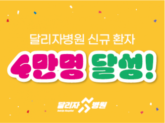 안녕하세요. 오늘은 좋은 소식을 들려드리러 글을 씁니다.3주년이 조금 지난 이 시점에 달리자병원 신규 환자 누적이 4만명을 달성했습니다.많은 분들이 찾아주시는 만큼 달리자병원도 더 성장하고 노력하며 만족스러운 의료 서비스로 보답하겠습니다.달리자병원을 믿고 찾아주셔서 정말 감사드립니다.이번 4만번째 주인공은 종아리 통증으로 방문했던 쌍둥이 형제였습니다!다행히 큰 질병은 아니고 무리한 활동으로 인한 근육통이었습니다.적절한 휴식과 수면으로 빠르게 회복되길 기원합니다.이번 이벤트가 형제들에게 소중한 추억이 되었으면 좋겠습니다 ^^