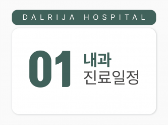척추관절, 골절외상, 내과검진365일 함께 달리는 달리자병원입니다.달리자병원 내과 11월 휴진 안내입니다. 11월1일(토) 휴진11월15일(토) 휴진11월29일(토) 휴진일요일 휴진※ 매주 금요일 오후 휴진(오전9시 - 오후1시까지 진료)※ 일요일 및 공휴일 휴진※ 토요일 격주 휴진내원 및 예약 시 참고해주시기 바랍니다.--------------------------★--------------------------달리자병원 예약방법대표번호 1670-7515네이버톡톡 / 카카오플러스 @달리자병원
