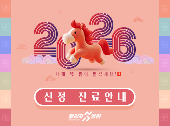 새해 복 많이 받으세요~달리자병원은 신정 1월1일(목)에도 정상진료합니다. 2026년 1월 1일 목요일정상진료AM 9:00 - PM 2:00*점심시간 없이 진료연말의 분주함 속에서도 건강만큼은 꼭 잘 챙기시길 바랍니다.따뜻한 연말 보내시고, 진료 일정 꼭 확인하시어 방문에 불편 없으시길 바랍니다 :)